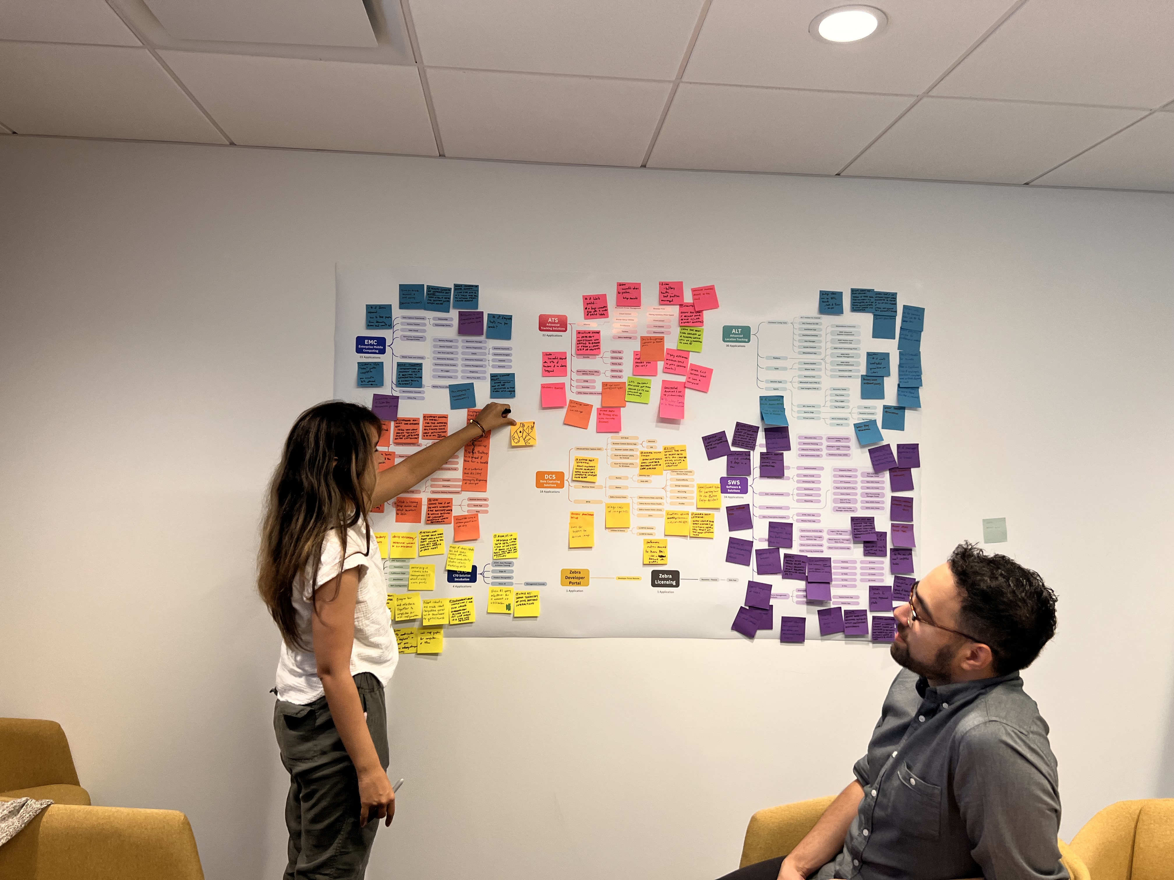 Participants paired with someone from a different business unit to identify how platforms could work together. They drew connections between different colored sticky notes and filled out integration formulas.